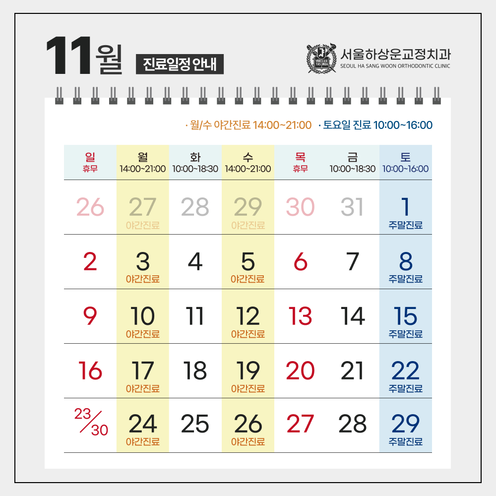 11월은 목요일정기휴진일을 제외하고는 정상 진료하오니 참고하시고 내원 하시길 바랍니다.~~^^