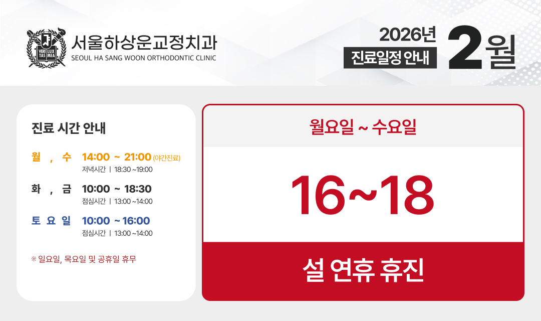 안녕하세요? 16일부터 18일까지는 설 연휴로 휴진하며, 19일은 정기휴진일로 휴진합니다. 참고 부탁드립니다.^^