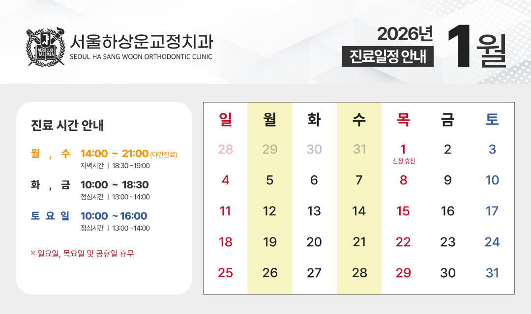 안녕하세요? 16일부터 18일까지는 설 연휴로 휴진하며, 19일은 정기휴진일로 휴진합니다. 참고 부탁드립니다.^^